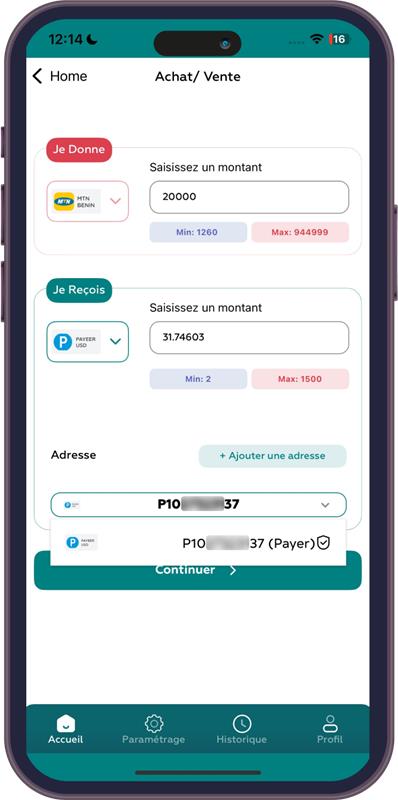 4. Saisissez le montant à recharger. Ajoutez votre adresse Payeer si ce n’était pas encore fait puis cliquez sur Continuer.